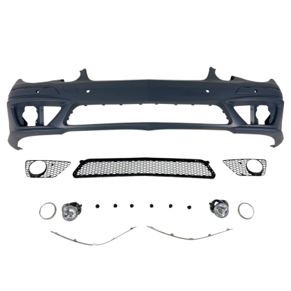 Предна броня за Mercedes W211 E-Class (2006-2009) – AMG с отвори за парктроник, с халогени грундирана